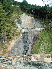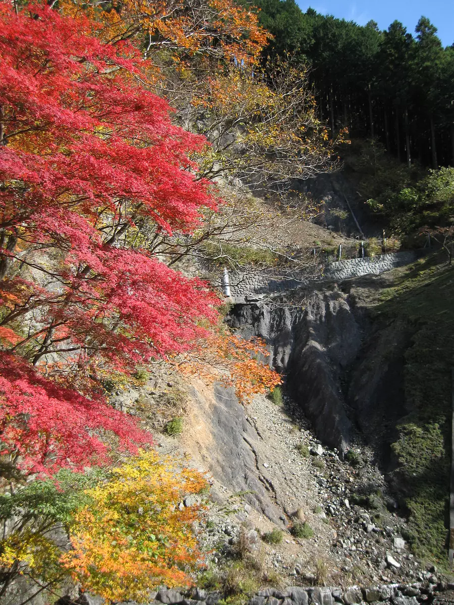 日本で最大規模の断層で、関東から九州まで約1,000kmも続いています。断層のズレが極めて大きく、中央構造線を境に分布する岩石の種類が異なるのが特徴です。(国指定天然記念物)