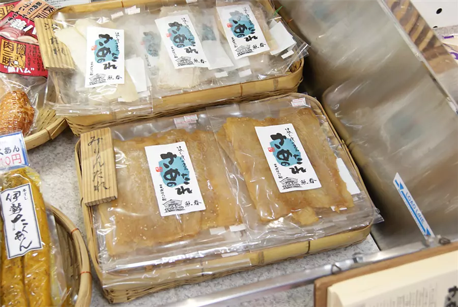 創業85年を超える「魚春」。元々魚屋さんだった店主が、観光客に向けてお土産に伊勢志摩の活き活きとした魚介類を味わってほしいと販売し始めたのが創業のきっかけ。名産の「さめのたれ」は、伊勢志摩でも限られた地域でしか手に入れられない貴重な干物。雑誌やTVでも紹介され、これを味わうために足を運ぶ観光客も。磯の香りがふんわり香る三重県産の「あおさ」もお味噌汁やサラダにもよく合います。また、魚介類に限らず伊勢ならではのオリジナルグッズやお菓子なども取り扱っています。