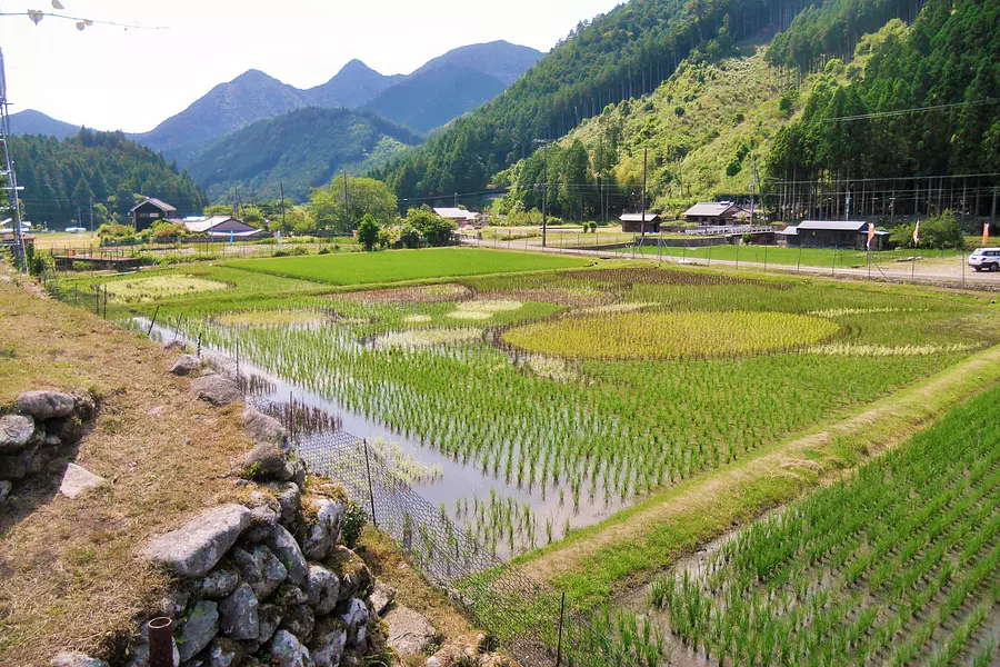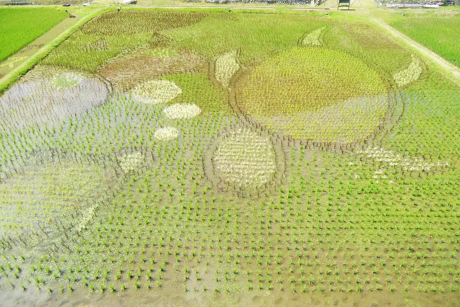 熊野市飛鳥町小又地内の田んぼに一面に現れる田んぼアート。今年のデザインのテーマは「南紀の海(海ガメとみかん、七里御浜)」。地元の高校生がデザインしてくれました。田んぼアートは、田植えから収穫の間に色が変化していく古代米の特徴を利用して作成されています。そのため、時期によって色の変わる田んぼアートを収穫時期まで楽しむことができます。
