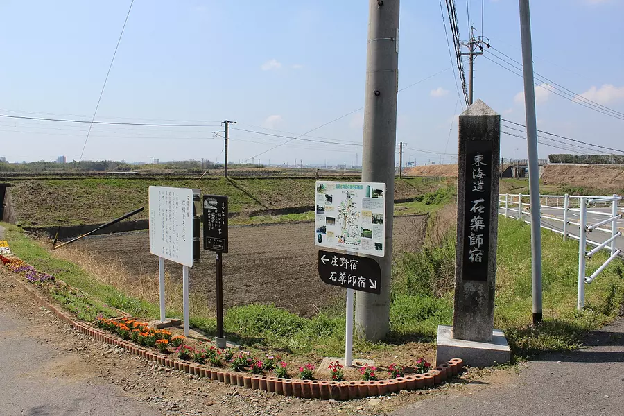 石薬師の一里塚は,もと蒲川の西岸に位置し,かつては東海道の両側に榎が植えられていた。