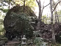 高さ10mはあろうかという球状の岩が鎮座し、岩と樹木が同化しているのがわかります。社殿はなく、祭神も不詳。原始の山岳信仰を受け継ぐ修験者たちの修行の場であり、巨岩に岩を感じる自然信仰の原点とも言われる場所です。