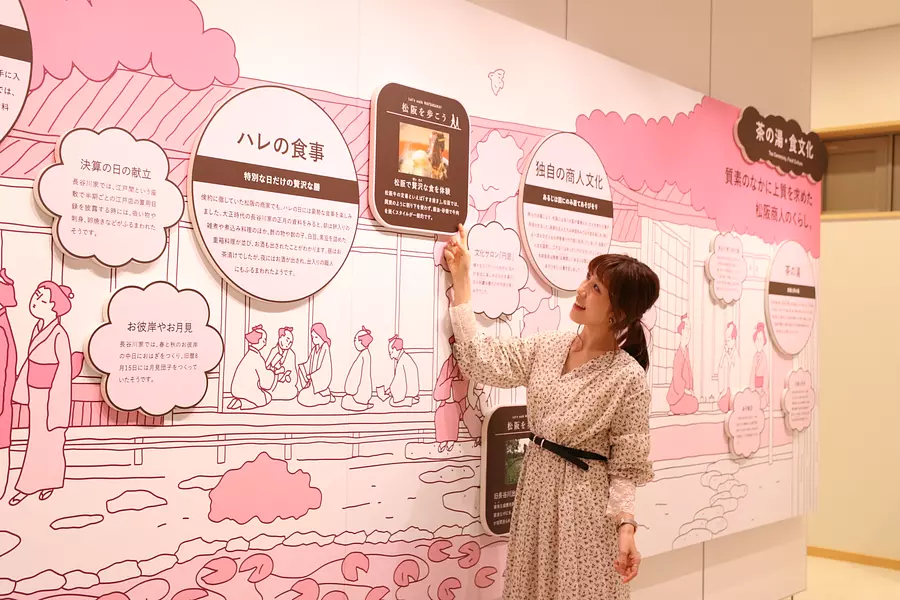 参宮街道の賑わい、松阪の偉人、松阪商人など、松阪のまちの歴史・文化の魅力を盛り込んだ展示や映像展示でじっくり学ぶことができ、市内の観光スポット、松阪の産品、飲食店の情報も知ることができます。まちあるきアレンジメントサービス(情報端末)を使えば自分だけのオリジナル観光コースを作ることもできます。