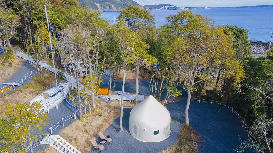太陽の日差しが降りそそぐ白いビーチとどこまでも続く紺碧の海。ここは三重県南伊勢町は田曽白浜海岸。ビーチから徒歩1分の小高い森の中に、不思議な波止場があります。やさしい木陰に停泊するのは3艇のヨット。日本初の森のマリーナです。