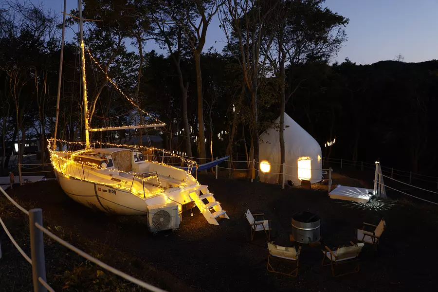 航海の気分高まるインテリアは見た目からは想像できないほど広く、くつろぎの空間。夏場でもエアコン完備で快適にお過ごしいただけます。甲板の上に寝転んで夜空を見上げれば、樹間にきらめく満点の星。いにしえから変わらぬ星座に想いを馳せつつ、旬のシーフードに舌鼓を打てば気分は大航海時代へタイムスリップ。そんなとびっきりの非日常を、ここTASO FOREST MARINAで、ぜひ大切な人とお過ごしください。