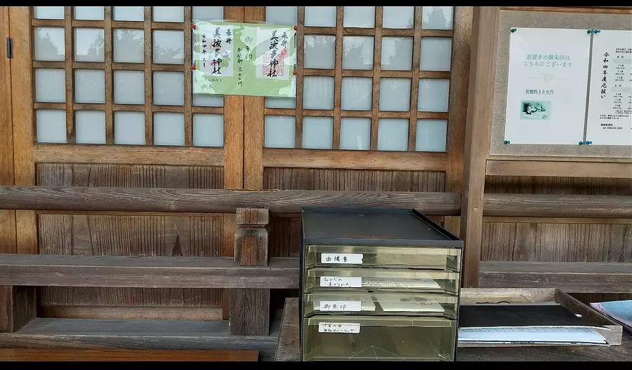 美波多神社は女性の宮司さんなので月替わりの御朱印は、やさしいタッチの花が描かれています。どなたもいらっしゃらないときは、御朱印の書置きがあります。(1枚300円。引き出しに入れて下さい。)