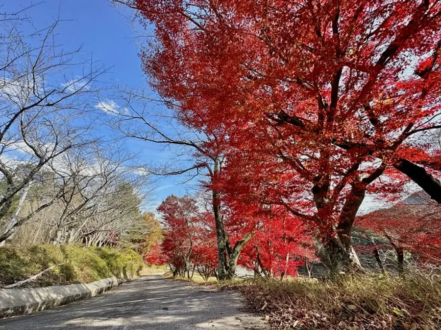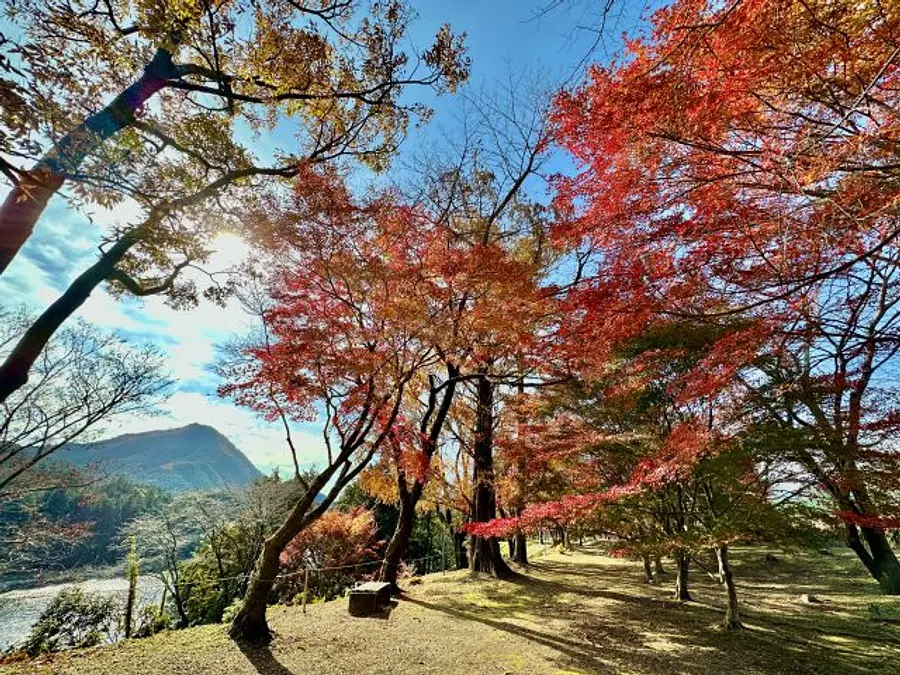 桜と紅葉の名所でもあり、約50本のもみじの木がある清流宮川沿いの粟生頭首工もみじ広場の紅葉は12月初旬が見頃です。