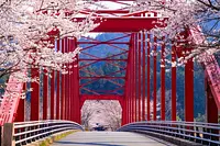 大台町長ケ(なが)に架かる赤い陸橋。両端に見事な桜が広がる撮影スポット。一般道のため通行にご注意ください。