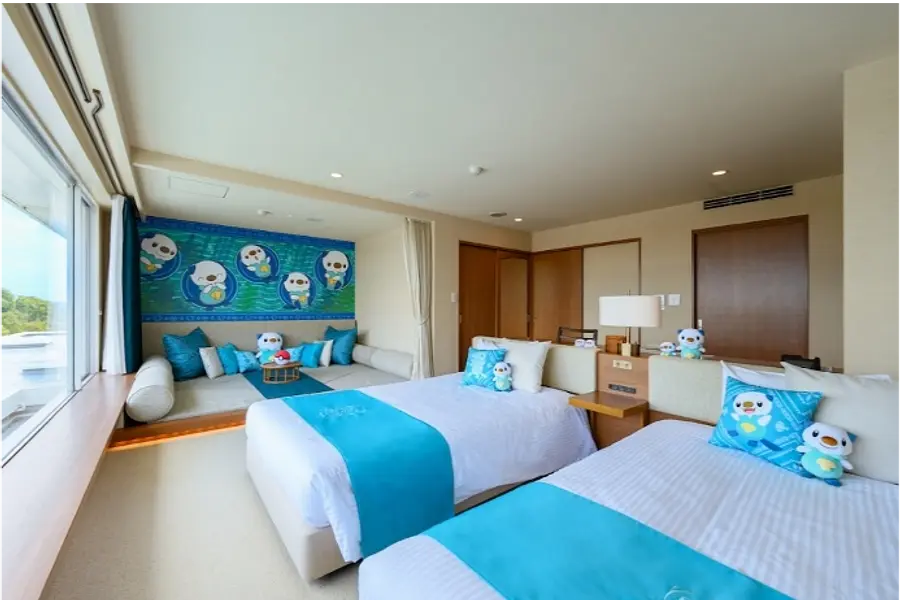 みえ応援ポケモン「ミジュマル」とコラボした1室だけのコンセプトルーム「ミジュマルルーム」では、客室の小上がりの壁面など、お部屋のあちこちで「ミジュマル」がみなさまをお迎えするほか、客室内にはさまざまなミジュマルと三重県産品のコラボアイテムを揃えています。