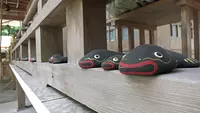 欄干に並んでいるなまずはお守りの「願掛けなまず」が願いをかなえて奉納されたものだそうです。