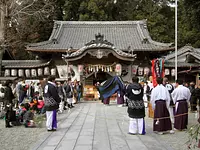 2月1~5日には尾鷲市の例祭・ヤーヤ祭が盛大に開催されます。神社境内にある2本の巨大な楠は、道路にまではみ出すほどの大きさ。昭和12年に県の天然記念物に指定されており、周囲10mにも達し樹齢は1,000年以上と推定されます。