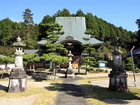 朱塗の楼門が緑に映える。木造大日如来像他。