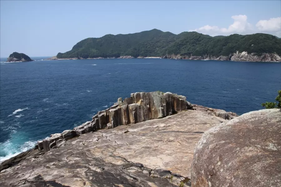 海から眺める、熊野灘の荒波に造られた壮絶なリアス式海岸の美しさ、二木島湾口に聳え立つ柱状節理、鮮やかな大岩壁「楯ヶ崎」とその背後に聳える「海金剛」の迫力は見るものを圧倒します。