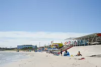 名古屋・関西方面からたくさんの観光客が足を運びにぎわう遠浅の海水浴場。夏場には海の家が営業します。隣の国府海岸より波が穏やかですが、サーフィンを楽しむこともできます。