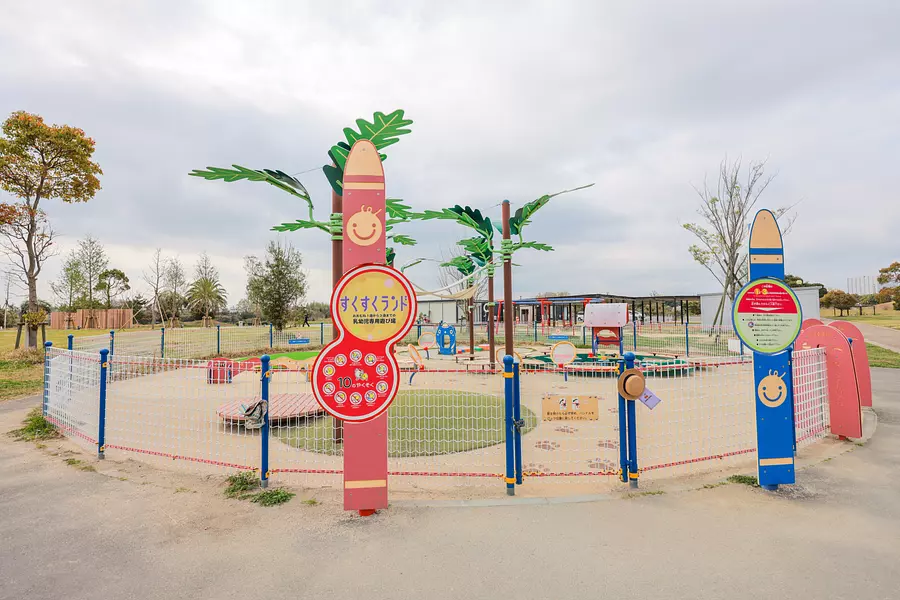 園内には広大な芝生広場や大きな噴水のほか、コンビネーション遊具、乳幼児向けの遊具、アスレチックなどがあります。