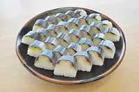 熊野灘でとれた脂肪分の少ないさんまを背開きにし、塩つけしたものを水洗いし、これを更にみかん酢につけ、すしご飯の上に尾、頭のついた姿のままのせてあります。