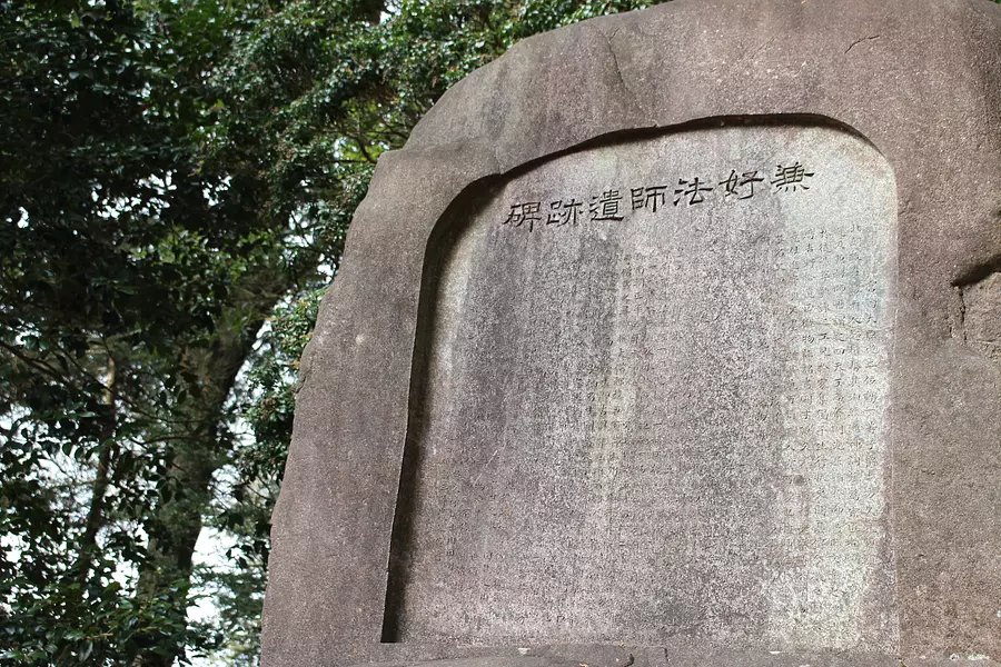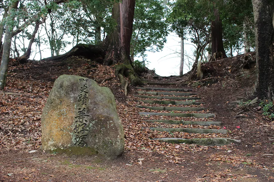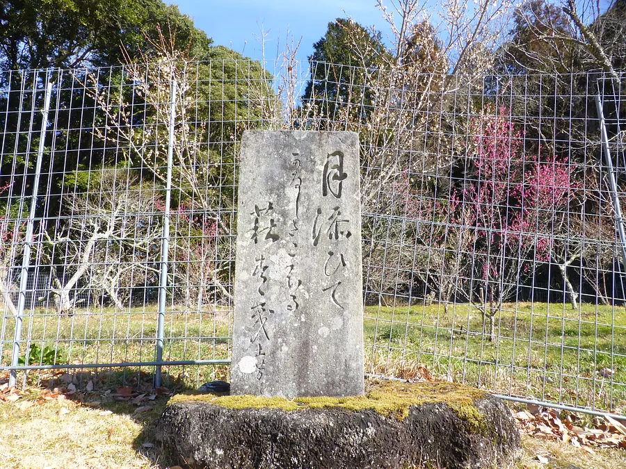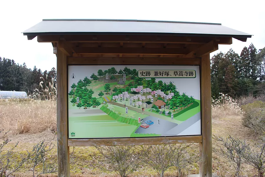『徒然草』で知られる兼好法師を祀る草蒿寺跡の「兼好法師遺跡公園」内に地元の人が誇りとする兼好塚があります。草蒿寺跡には「兼好法師終焉の地」の石碑が建ち、森の奥には「南朝忠臣兼好法師」と刻まれた顕彰碑と、木々に囲まれた塚があります。遺跡地は東西20m、南北30mの平坦な雑木林で、高さ1.2mの遺跡碑が中央に建てられ、碑の前に土石がすこし高く積み上げられていて、これが兼好の塚と言われてます。