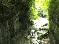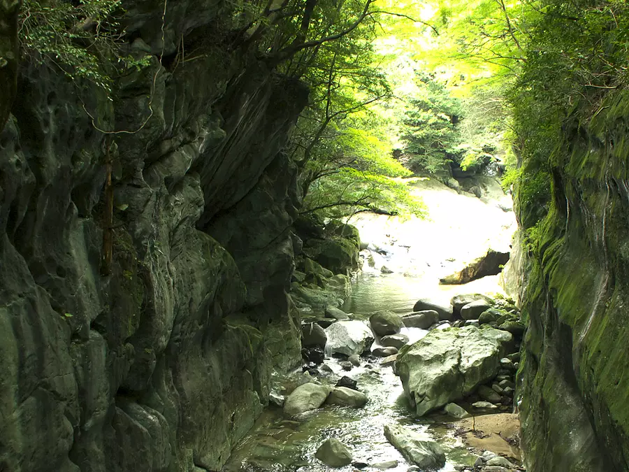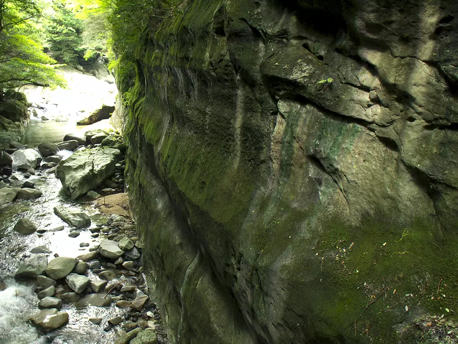 小岐須の屏風岩は県の天然記念物に指定されています。屏風を立てたようにそそり立つのが特徴です。下流の右岸には石灰洞もあります。
