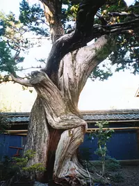 戦国時代の有馬城跡には現在天理教有馬分教会があり、そこに大きく枝を張り、根が盛り上がった威風堂々としたイブキがあります。樹齢は800年ともいわれています。