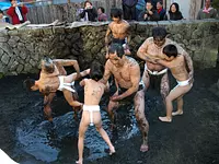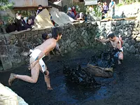 路地の一角に石積みの囲い。元旦には泥んこ相撲をとる奇祭「ニラクラ祭」が行なわれる。