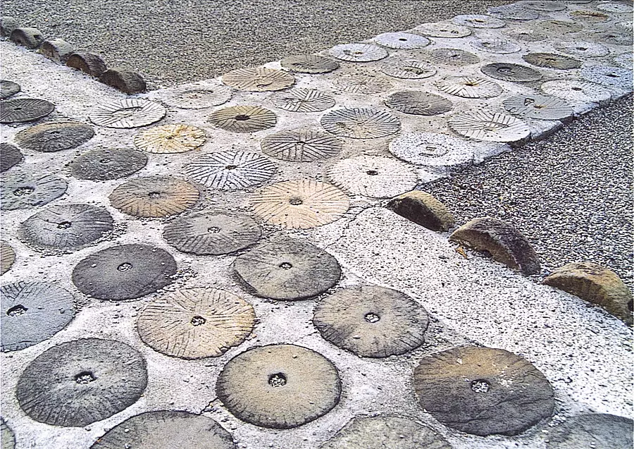 境内の参道には染め物に使う糊の原料となる大豆を挽いたとされる石臼が