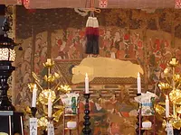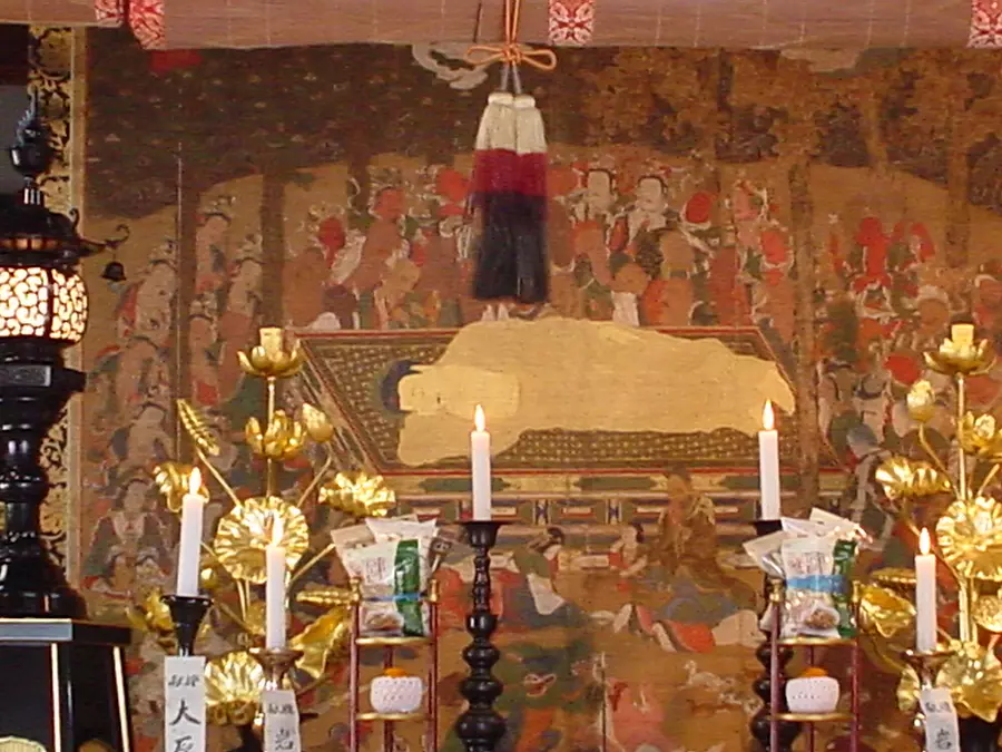 戦国時代の榊原氏の菩提寺。毎年、3月14日から16日まで開帳される涅槃図は、縦3.4m、横2.58mとたいへん大きなもので、室町時代の作。他のものには見られない三毛猫が描かれています。