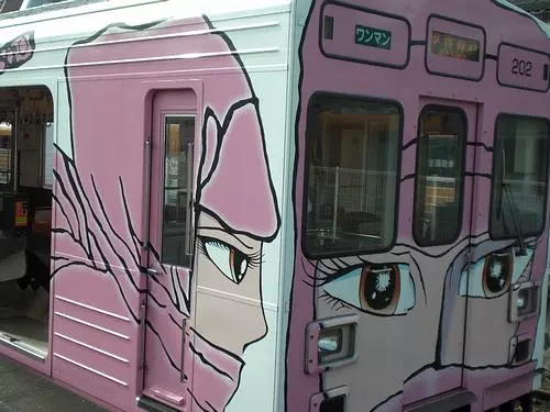 伊賀鉄道で運行されている「忍者ペイント列車」。銀河鉄道999などで有名な松本零士デザインの列車で、鉄道ファンの間では「くノ一号」や「忍者号」などの愛称で親しまれている。伊賀神戸~上野市~伊賀上野間で運転。運行時間は前日夕方に決定する。