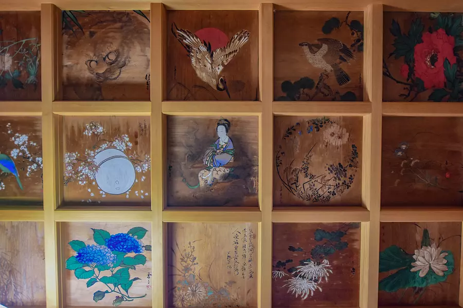 野村訥斎とその弟子たちによって描かれた48枚の格子絵天井が有名。