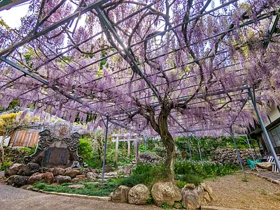 正保三年(1646年)開山とされています。 丁寧に手入れがされた庭が美しい。 境内には藤棚や御衣黄桜、シャガが咲き誇ります。 特に藤棚を上から眺められるスポットは珍しく、まるで美しい紫の絨毯のよう。 藤の咲き始めは上向きに咲くため、上から見る場合は早めのご訪問がおすすめ。 咲き始め・満開の二度楽しめて、季節になるとカメラを携えた人が訪れます。 ※藤・御衣黄桜について、...