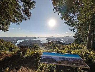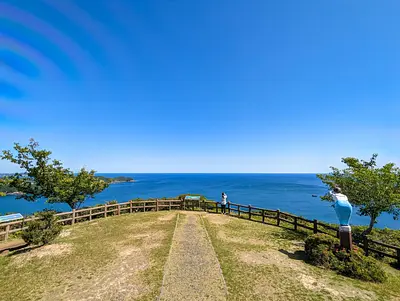 海抜約150mに位置し、水平線や入り組んだ五ヶ所湾など360度の大パノラマが楽しめる展望台。 美しい曲線を描く相賀ニワ浜や、国内でも珍しい海跡湖(かいせきこ)の大池(おいけ)なども見ることができます。 特にこの風景は、日本三景の天橋立にも見えると話題に。 周辺には遊歩道もあり、クチナシ、ソメイヨシノなど季節の美しい植物を楽しみながら散策できます。鳥の鳴き声や、波の音を聞きながら歩く展望...