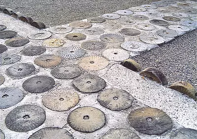 境内の参道には染め物に使う糊の原料となる大豆を挽いたとされる石臼が 敷き詰められています。 通称“石臼寺”。