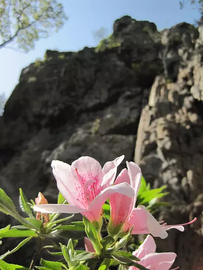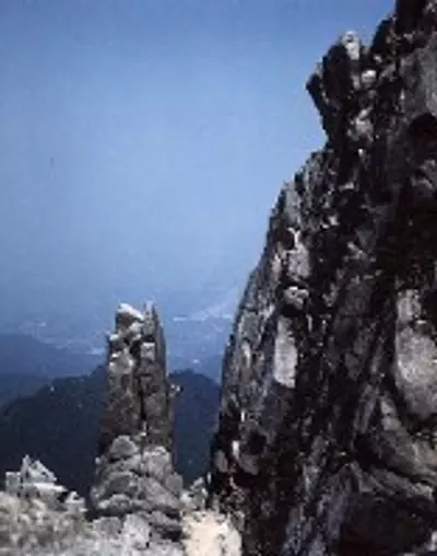 御在所岳の北隣にあるのが国見岳で標高は1160mあります。山頂付近には、石門、天狗岩、ゆるぎ石など奇岩があるほか、御在所岳の藤内壁を一望することができます。標高730mの山中には僧兵ゆかりの三岳寺廃寺跡があります。