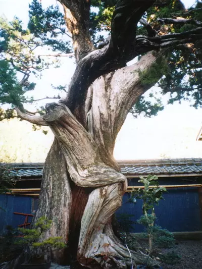 戦国時代の有馬城跡には現在天理教有馬分教会があり、そこに大きく枝を張り、根が盛り上がった威風堂々としたイブキがあります。樹齢は800年ともいわれています。