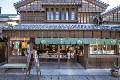 江戸時代、『参詣するなら、帰りに“どぶろく”だ!』と評判だったうどん屋さんを再現したのがこのお店。 『食べると福がある』とも言われていたことに因んで「ふくすけ」と名づけました。 鬼瓦にあしらわれた福助と、切妻・妻入りの軒が目印です。雪のように白く玉のように太い麺に、真っ黒いたまり醤油のタレをかけて食べる「伊勢うどん」がおすすめ。