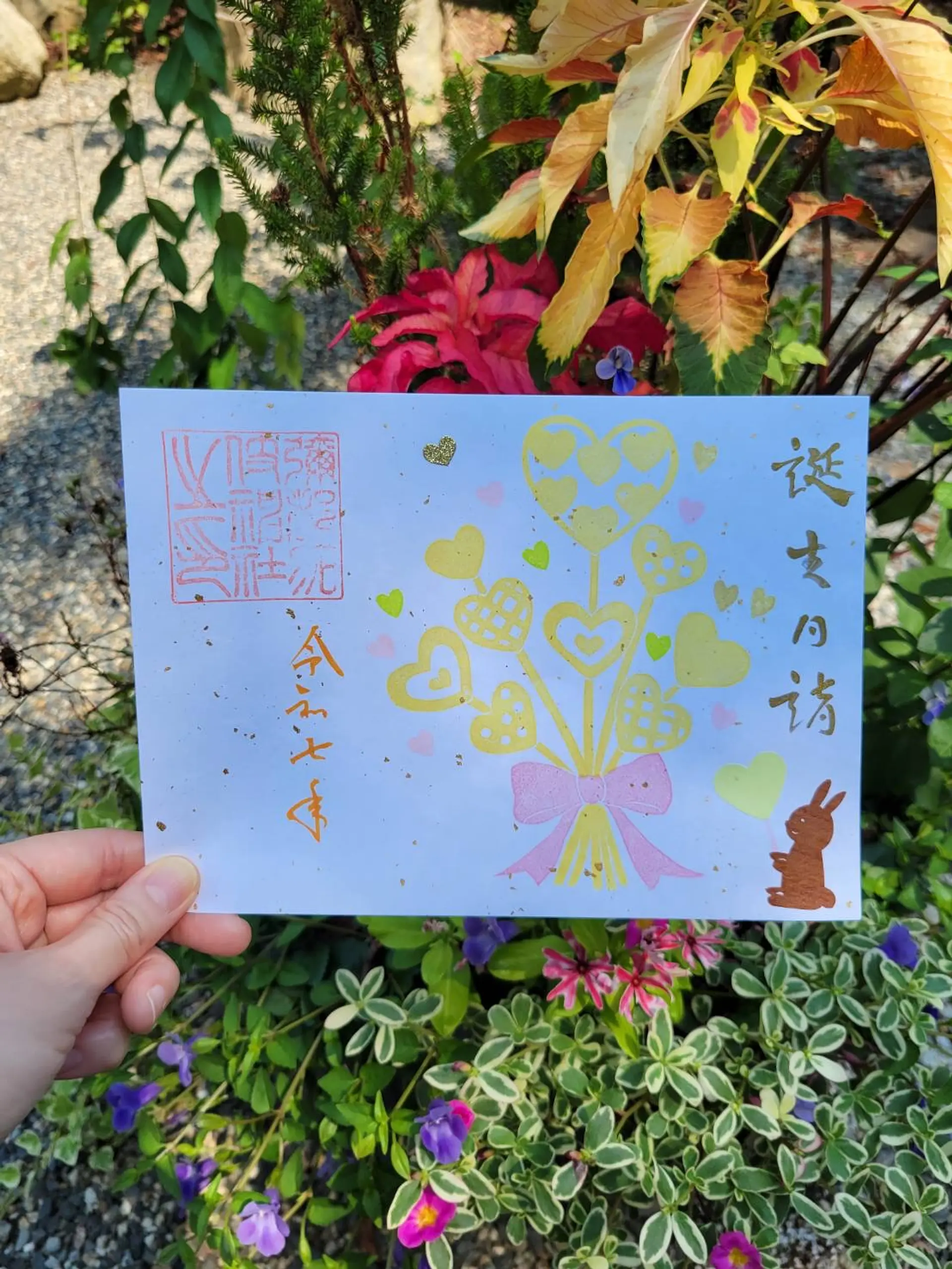 8月は季節の花「向日葵」や「花火」「金魚」をモチーフにした、夏らしい御朱印。そして8月の誕生日御朱印は黄色のハートを束ねたデザインです。御朱印には三重県鈴鹿市に伝わる国指定伝統的工芸品である伊勢型紙が使用されています。