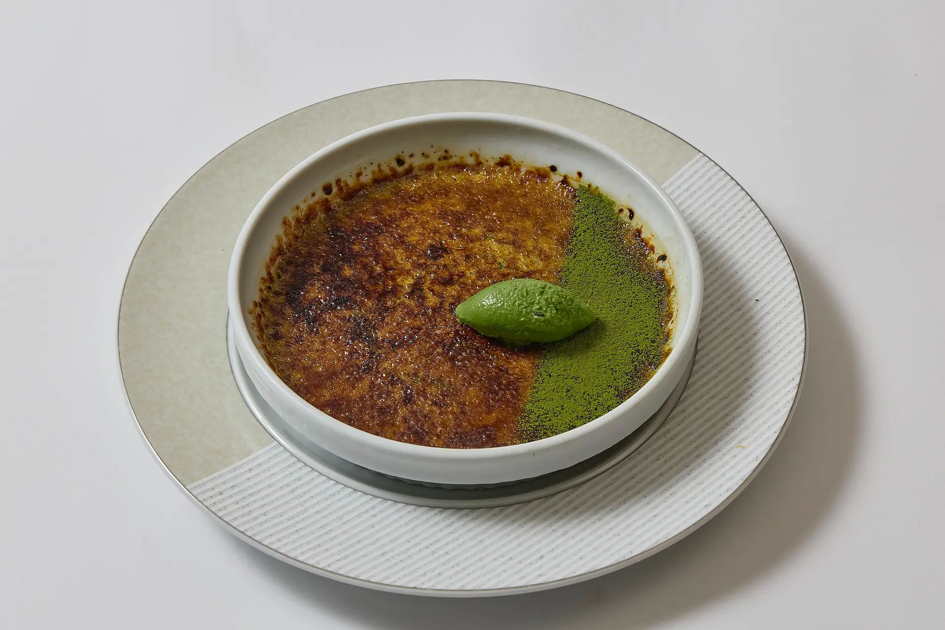 三重県四日市市の認定ブランド「泗水十貨店」の濃い抹茶グリーンティを使った、風味豊かなブリュレです。カリッと香ばしく、抹茶のほろ苦い後味がアクセントになります。