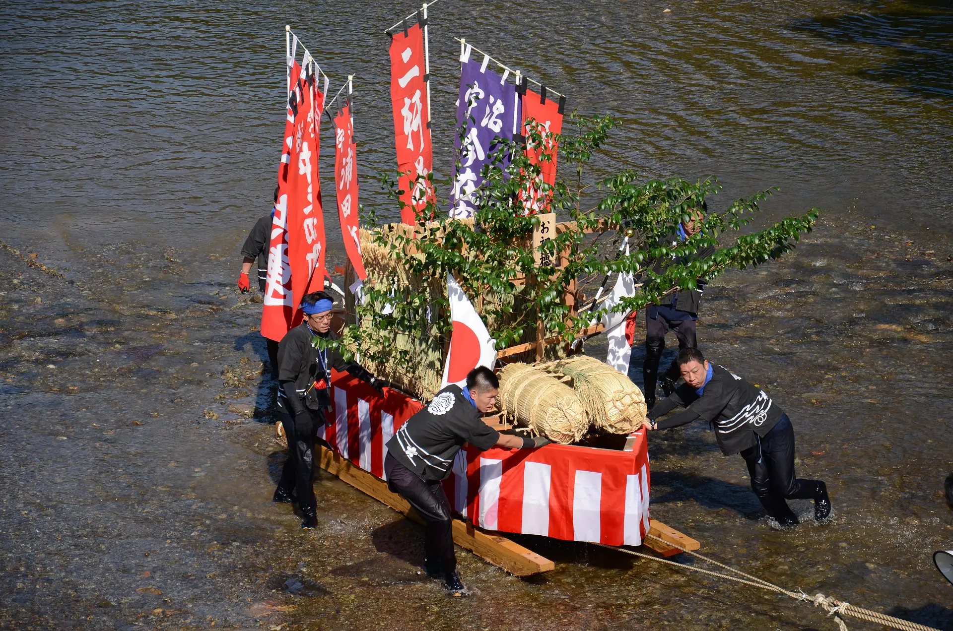 宇治橋の上から多くの参拝者が見守る中、米俵を積み込んだ初穂船が、浦田橋の下手から宇治橋まで、木遣り唄と法螺貝ほらがいの音を響かせながら川の中を曳き進みます。