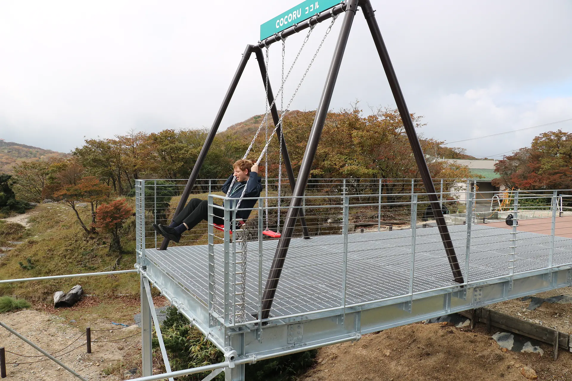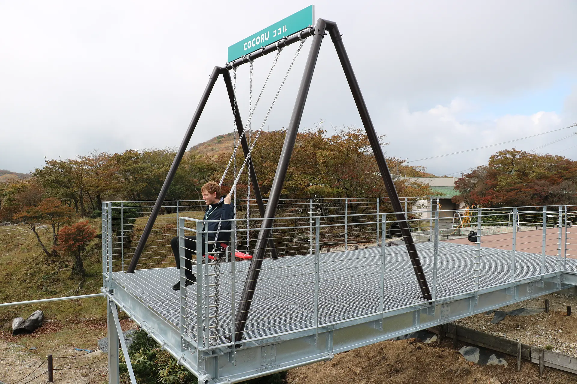 ブランコは展望テラスの端に設置されています。周辺がウッドデッキではなくグレーチング構造となっており、ブランコ前方部分は柵が設置されていないため、開放感や風景をより楽しむことができます!