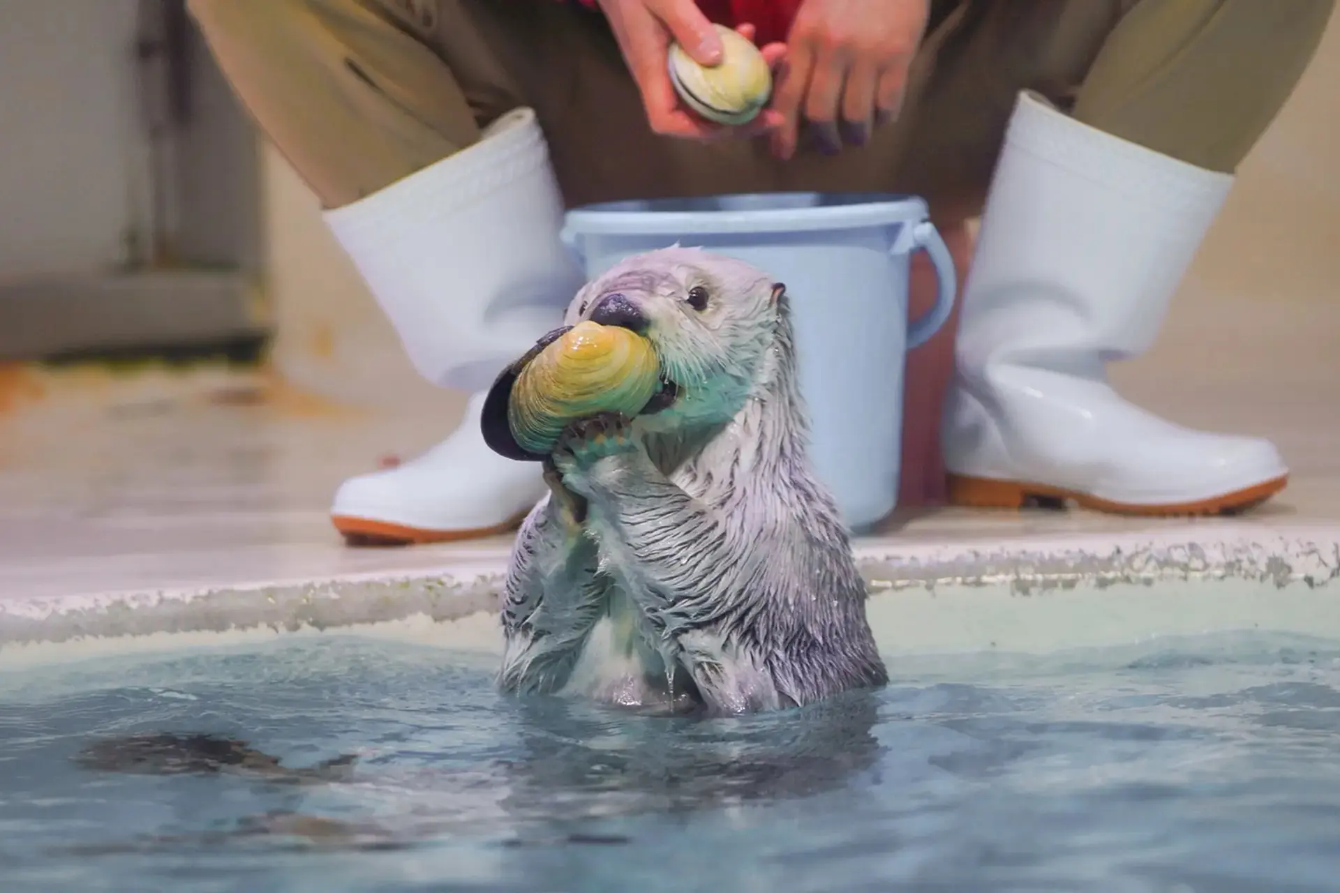 日本で唯一、ツメナシカワウソと握手ができる伊勢シーパラダイス。手で隙間をさぐって獲物を捕まえるカワウソ独特の習性を利用した体験イベントで、筒から小さな手をのぞかせて、かわいい手と握手ができちゃいます。