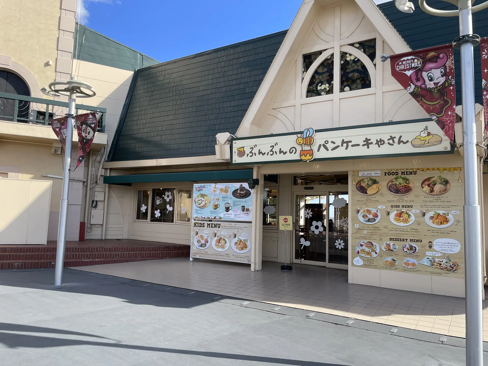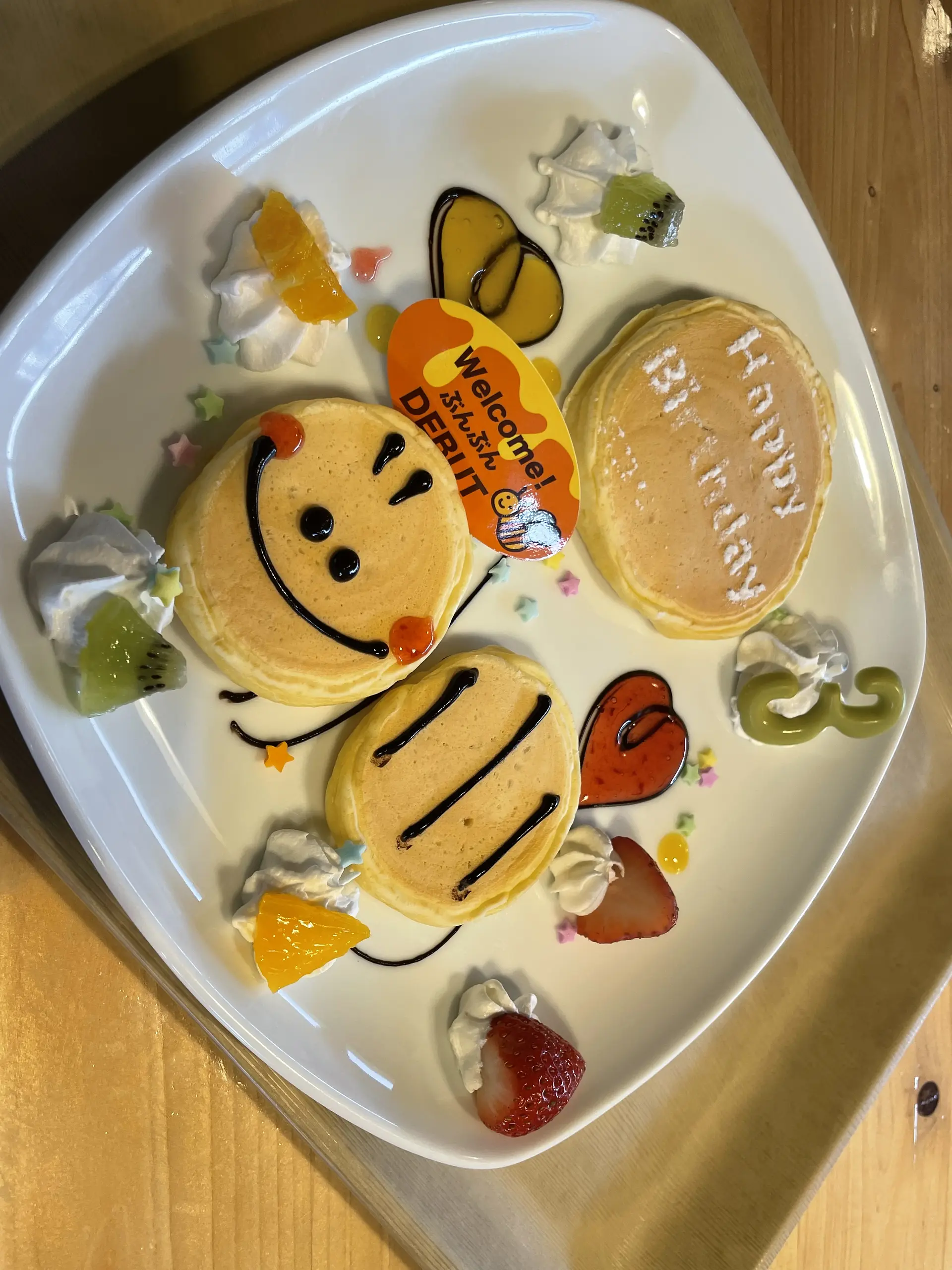 パーク内レストランの「ぶんぶんのパンケーキやさん」ではバースデーメニューがあります。こちらは、チョコの数字が選べる「ぶんぶんのバースデーパンケーキ」(1,100円)とってもかわいいパンケーキに子どももにっこり。