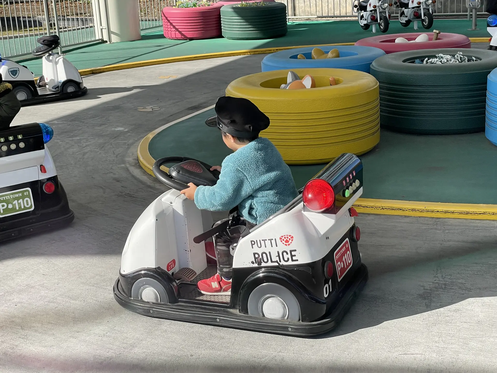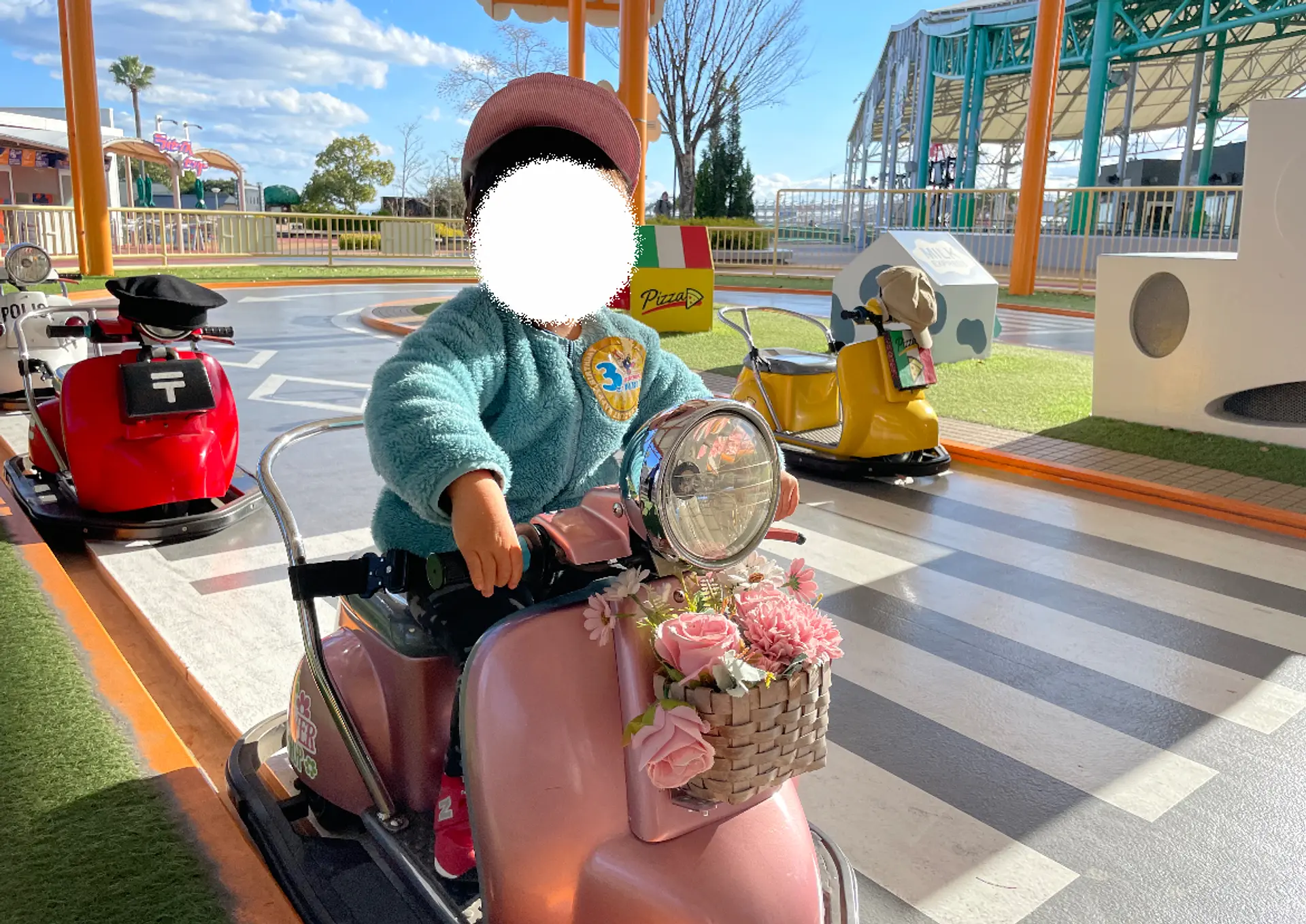 コチラのプッチタウンエリアとは離れたところにあるピピラのモトフィールドにあるアトラクション「ピンキーバイク プラス」も3歳から1人で乗れます!いろんな‘働く人’になりきってスクーター型バイクでコース内を走ります。ちゃんとなりきり用に帽子も用意されていて、郵便屋さん・牛乳屋さん・お花屋さん・ピザ屋さんなどになることができました!これまた「もう1回乗る!」と言って、3回も乗りましたよ!!1人で運転してコースを曲がったり、ブレーキをかけたりする様子に、成長を感じました。写真スポットもあって、たくさん記念に撮りました!