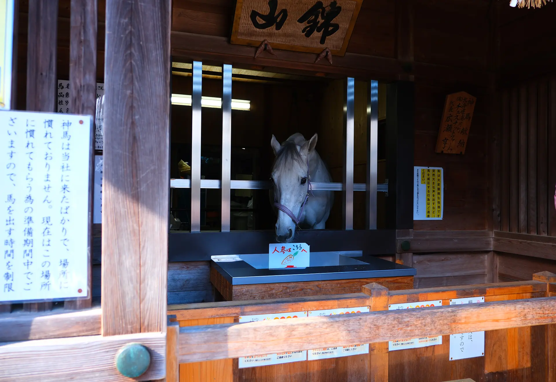 神馬舎の正面には人参を入れる箱があり、隣のスペースで売っている人参(1皿100円)で神馬にあげることができます。 神馬舎の後方部にもご飯の草がおいてあるようで、撮影時、神馬は後ろを向いて夢中で食事をしていました。そこで人参を箱に入れると正面を向いてくれました!
