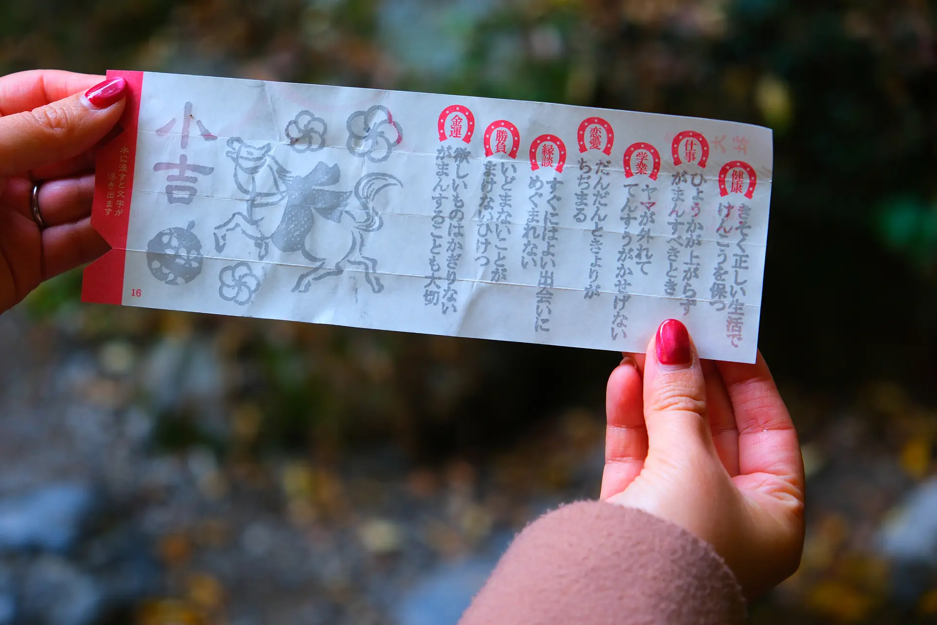 最初は開いてみても何も書いてありませんが、川の水に浸すと文字が浮かんできます!結果が良いほど馬の数が増えるそう!ぜひご自身の目でお確かめください。