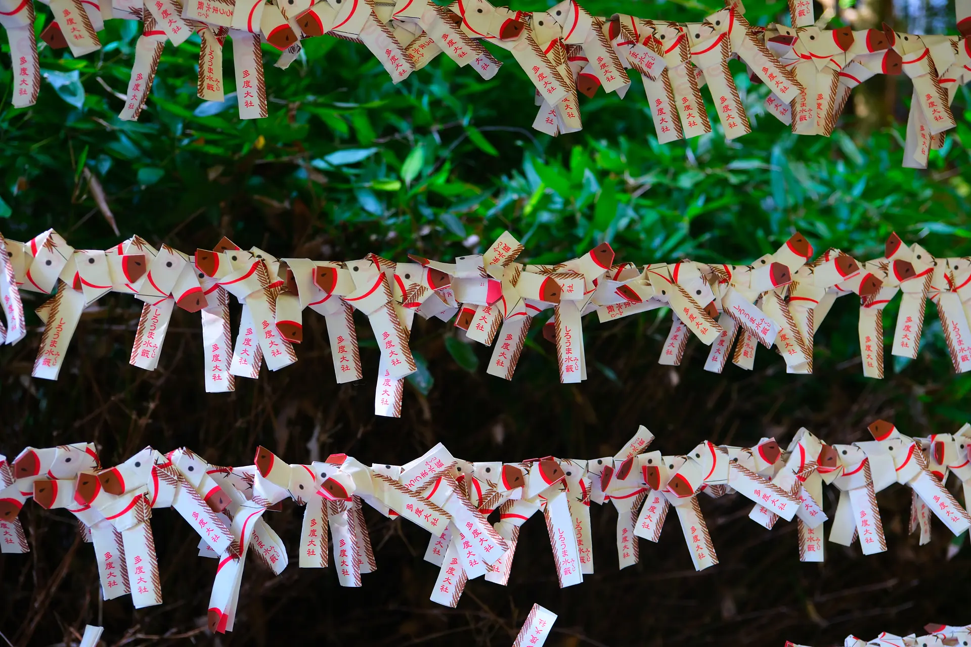 最後に川の近くにある結処に結びます。この結処に結ばれた水みくじの様子がとてもかわいらしいです!