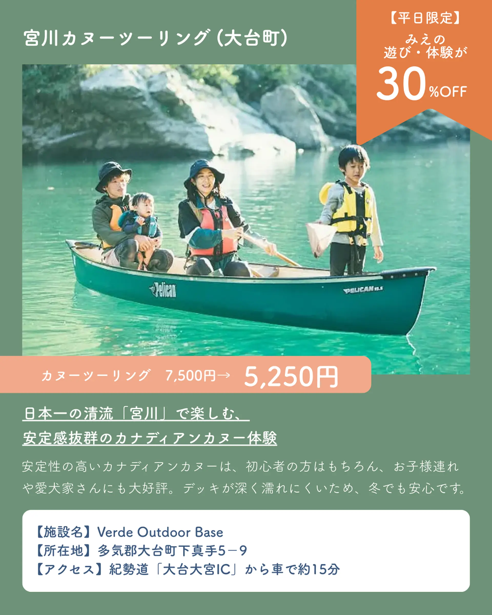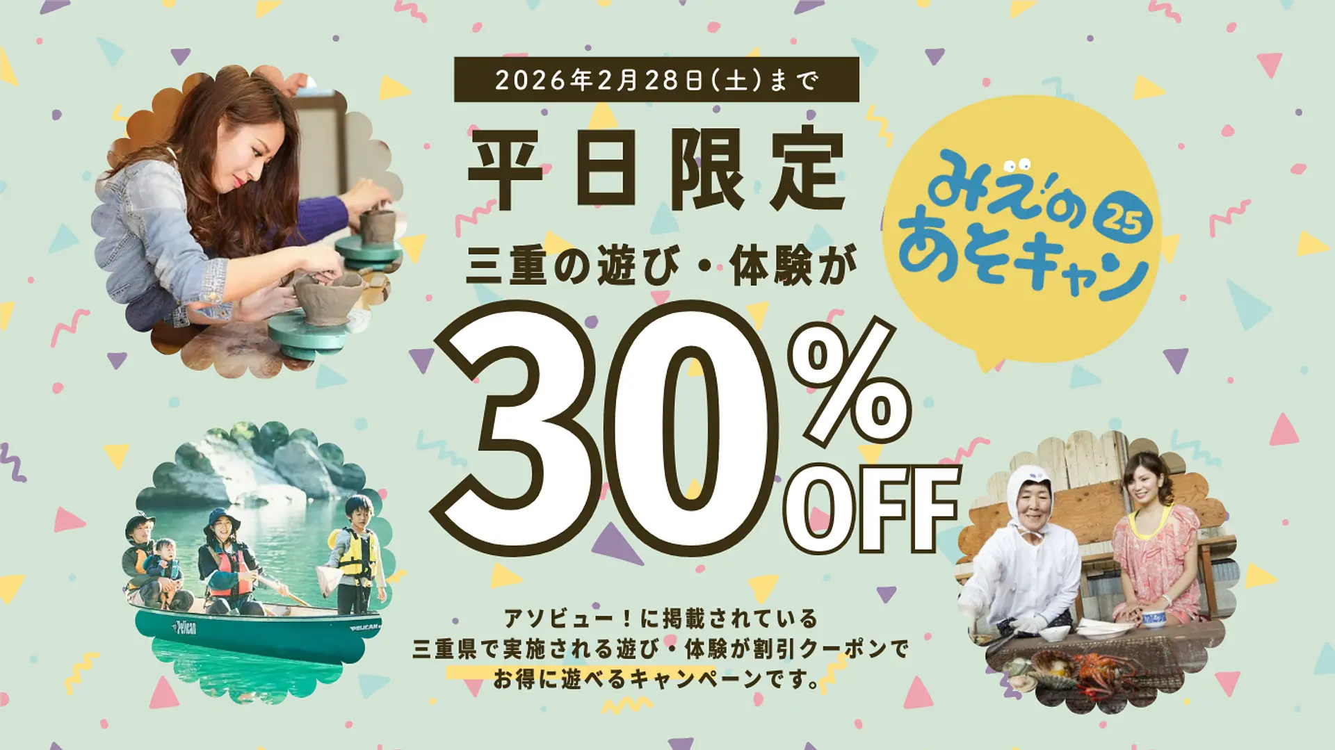 三重県では、県内の遊び・体験が平日限定で30%OFFになるキャンペーン「みえのあそキャン25」を実施中です。