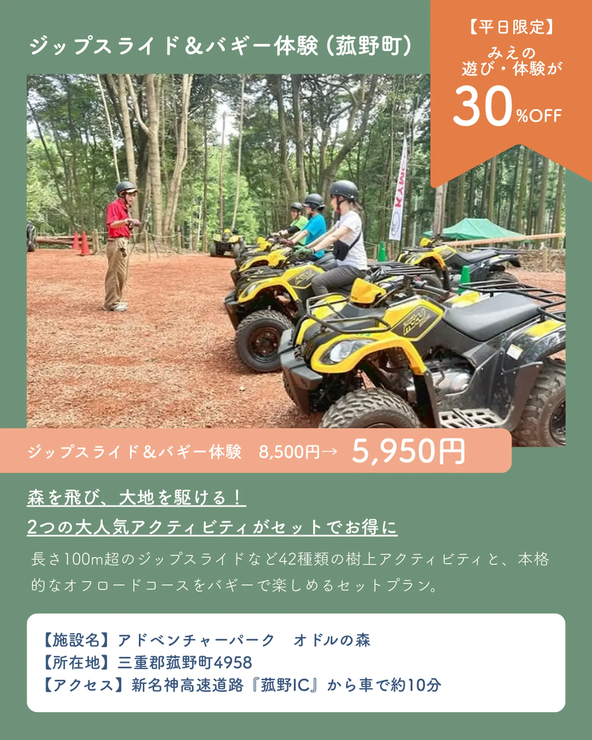 三重県内の遊び・体験が平日30%OFFになる「みえのあそキャン25」。