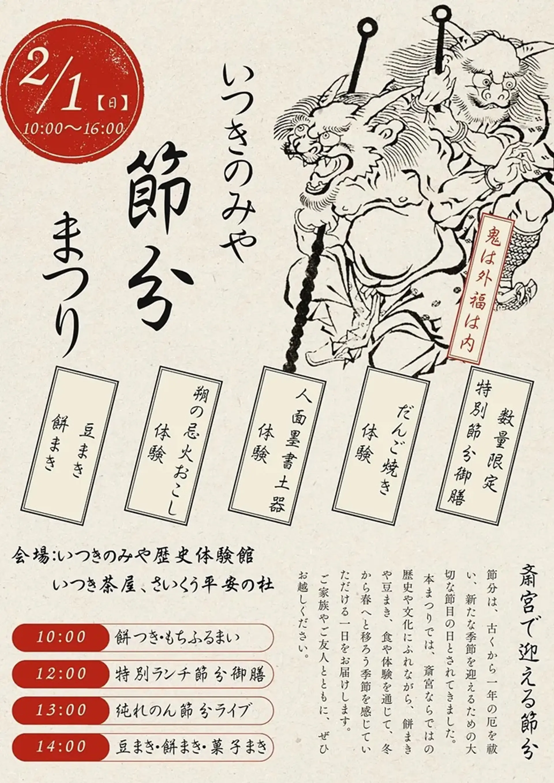 季節の節目である節分を迎える行事「いつきのみや節分まつり」が開催されます。斎宮ならではの歴史や文化にふれながら、餅まきや豆まき、食や体験を通じて、冬から春へと移ろう季節を感じていただける一日をお届けします。 ご家族やご友人とともに、ぜひお越しください。