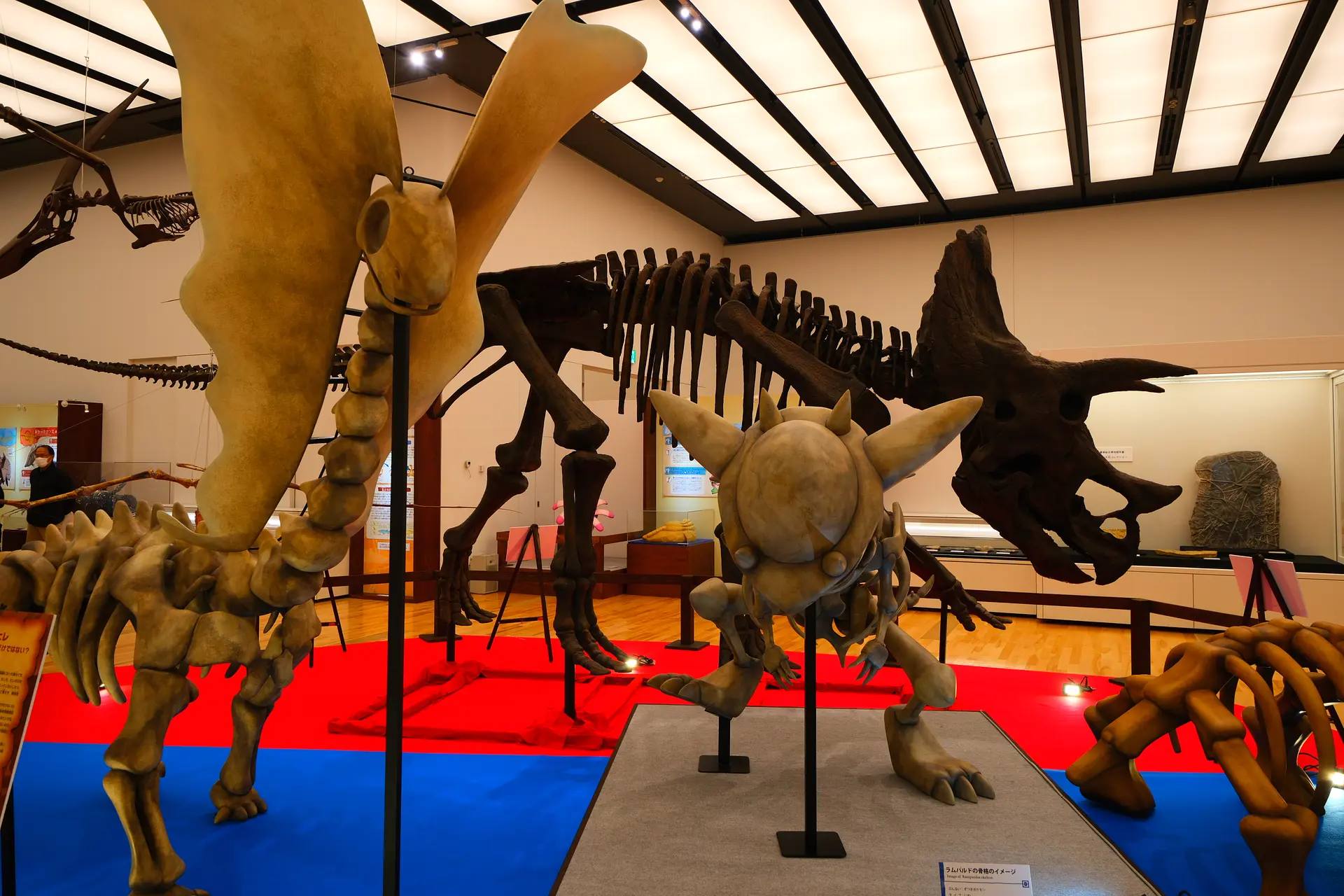 MieMuオリジナル展示の全長約7mのトリケラトプスや翼を広げた幅が5mある翼竜のアンハンエグラと、「カセキポケモン」の実物大骨格想像模型が並んで展示されています。他にも三重の恐竜「トバリュウ」にまつわる展示やかわいいポケモンいますので、ぜひ会場でご覧ください!