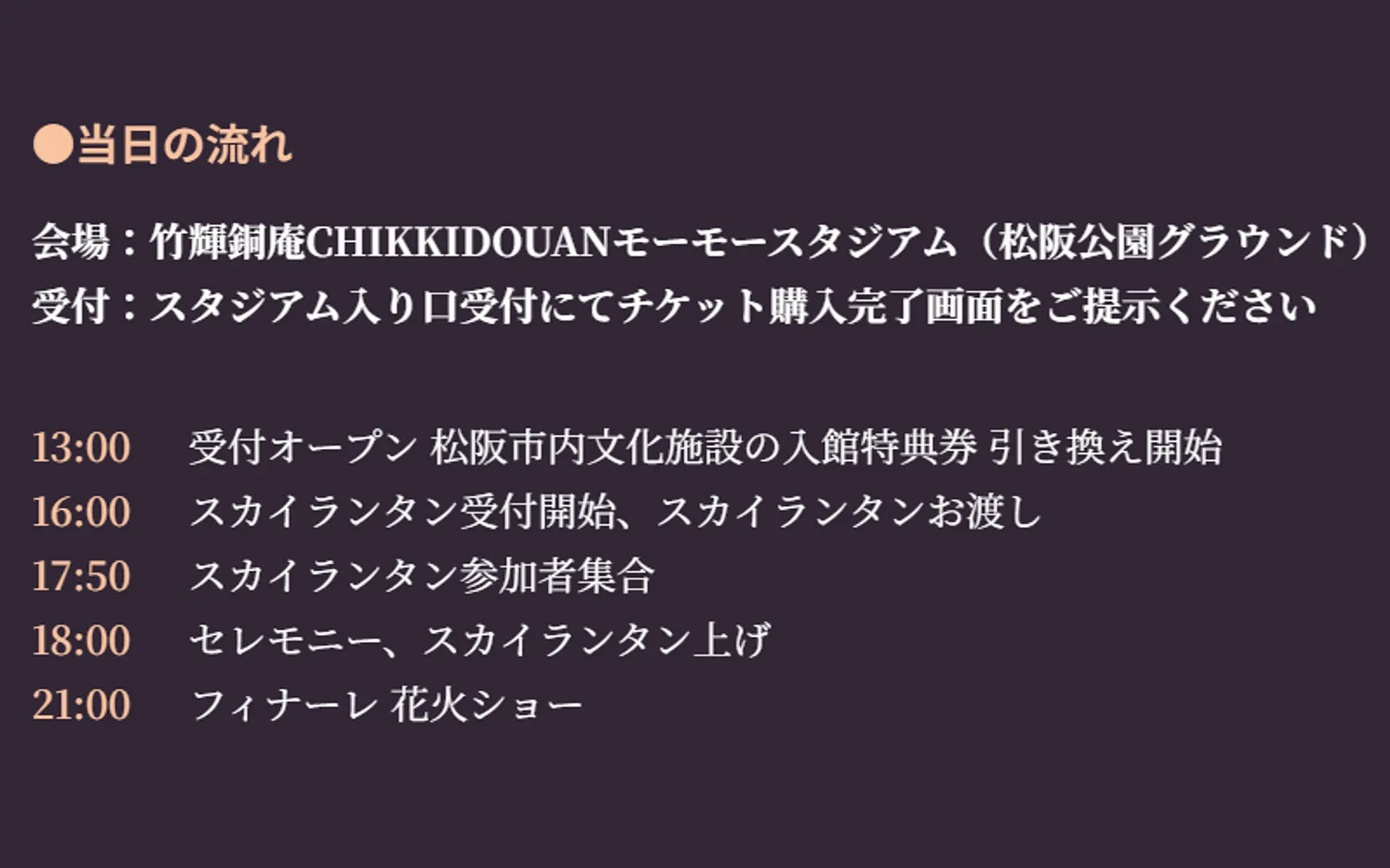 松阪市竹輝銅庵CHIKKIDOUANモーモースタジアム(松阪公園グラウンド)にて、1500基のスカイランタン上げイベントを開催します。また、松坂城跡の桜松閣庭園にて、100個以上ものランタンが庭園全体を幻想的に彩ります。他にも音楽・ダンスステージやグルメブース等楽しいイベントが盛りだくさん!