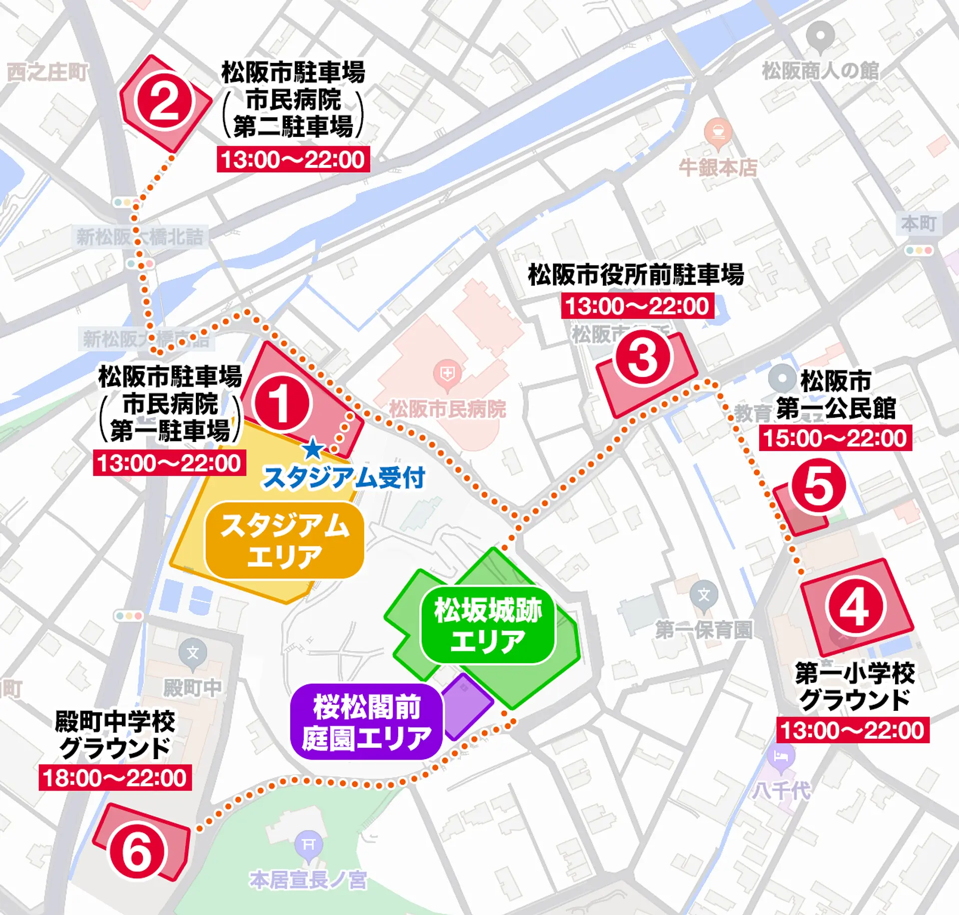 - ①松阪市駐車場(市民病院第一駐車場)