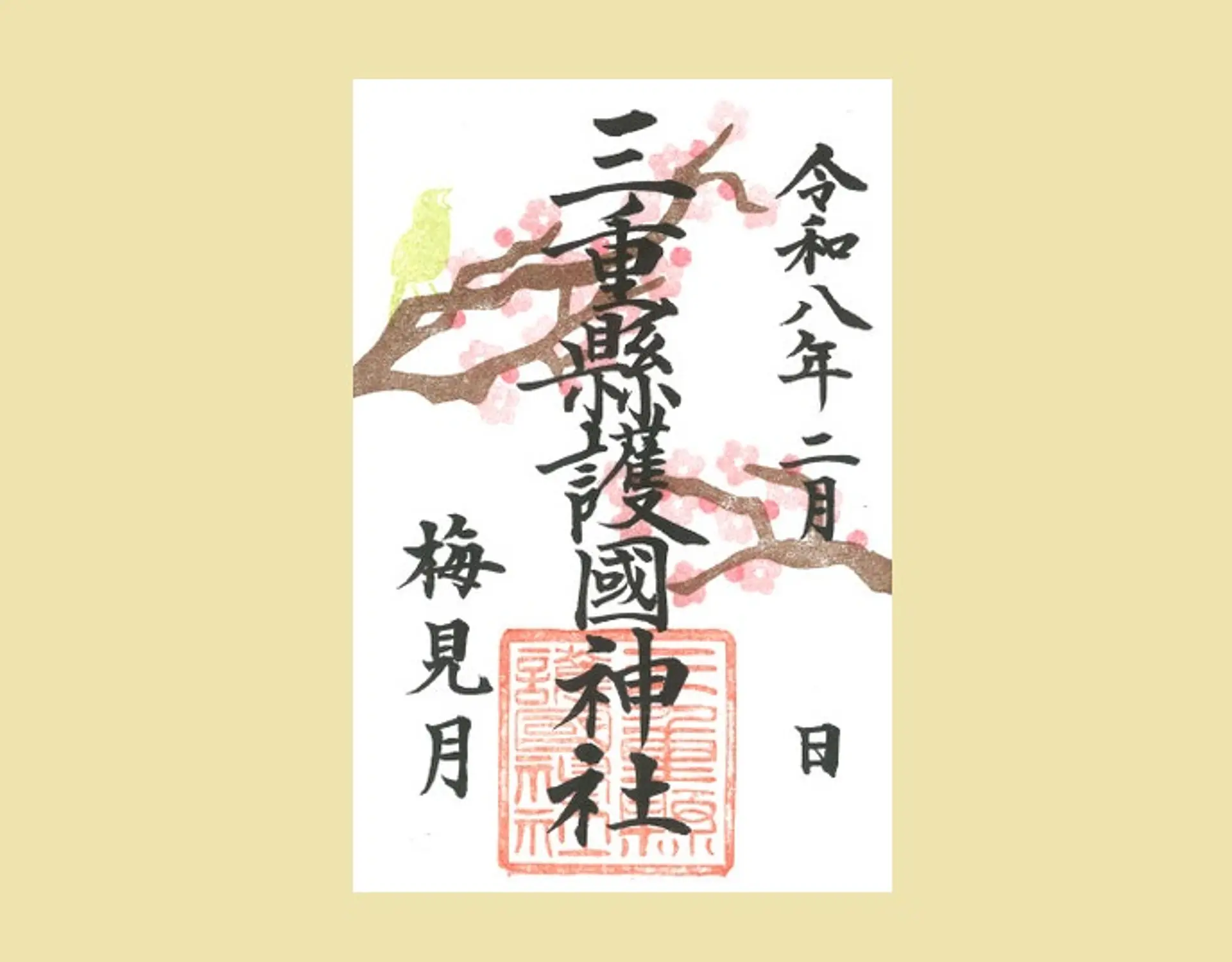2月限定の御朱印は、寒さの中で凛と咲く梅と鶯が配されたデザインの御朱印です。